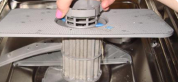 - Посудомойка не растворяет таблетку моющего средства. Это может быть признаком наличия какого-либо компонента, препятствующего попаданию воды с лезвия на таблетку. Возможно лезвие имеет забитые отверстия или коробка не открывается. Нужно убедиться, что лезвие не касается каких-либо элементов и это не замедляет процесс.